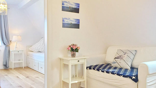 Hier haben wir einen weiteren Fernseher im ersten Zimmer rechts angebracht (durch welches man ins zweite Schlafzimmer gelangt), falls das Sandmännchen mal mit dem Heute-Journal oder der Tagesschau konkurriert. Hier finden Sie auch eine Nintendo Wii U mit einer Spielauswahl, sowie eine Dockingstation für die eigene Nintendo Switch falls mal die eine oder andere Stunde an einem Regentag überbrückt werden soll. Der Fernseher hier ist ebenfalls mit den oben genannten Streamingdiensten ausgestattet.
