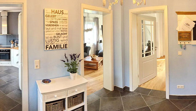 Es erwartet Sie ein dunkelgrauer Steinfliesenboden im Windfang, der sich bis in den geräumigen Flur, die Küche sowie das Gäste-WC erstreckt.