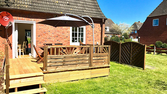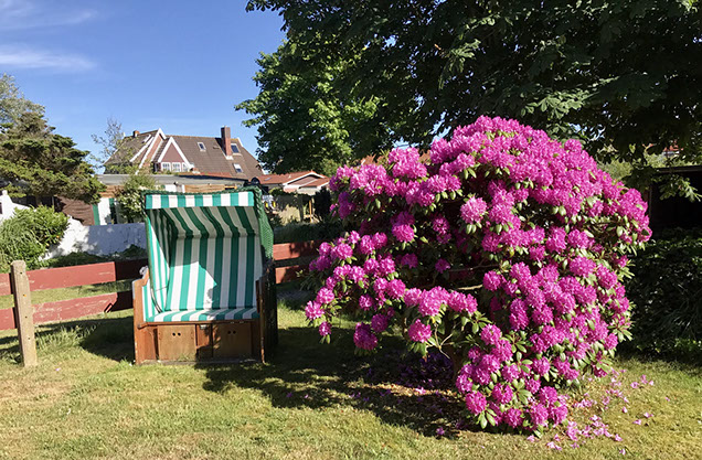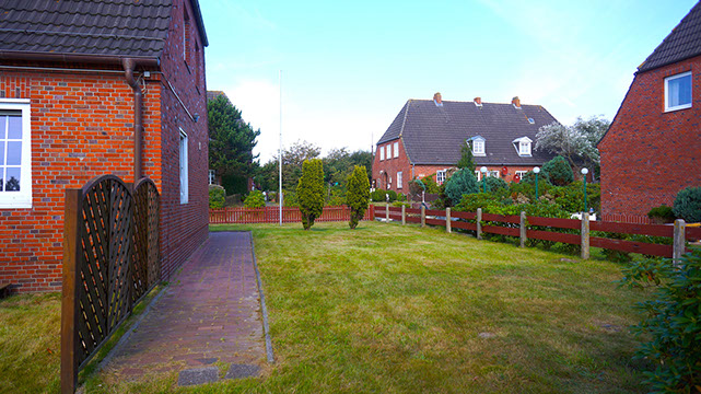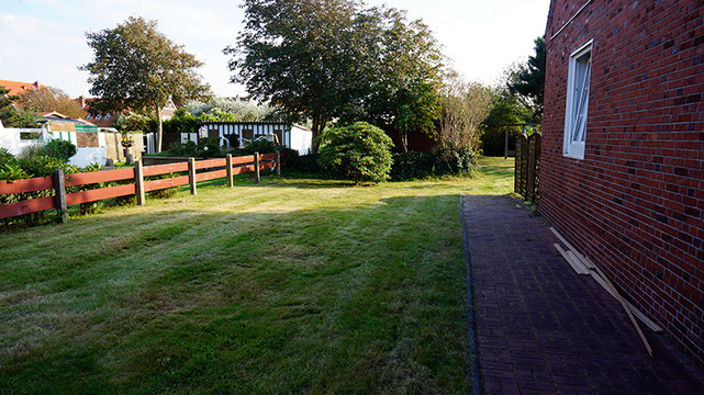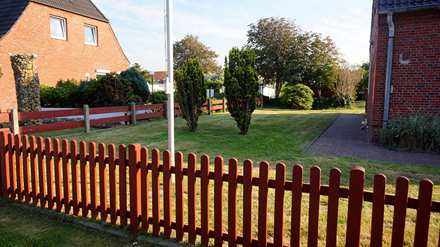 Der Garten wird nach und nach so gestaltet, dass Sie hier inseltypische Pflanzen und Sträucher vorfinden werden. Die Kräuterschnecke bietet Ihnen eine Auswahl an selbst gepflanzten Kräutern. Die Sitzecke am Ende des Garten, sowie der hauseigene Strandkorb sollen genauso zum Ausruhen einladen, wie die Schaukeln und das Baumhaus zum Spielen. Der Garten ist mit einer automatischen Bewässerungsanlage ausgestattet, welche ausschliesslich Grundwasser verwendet und so das Trinkwassersystem nicht beansprucht.