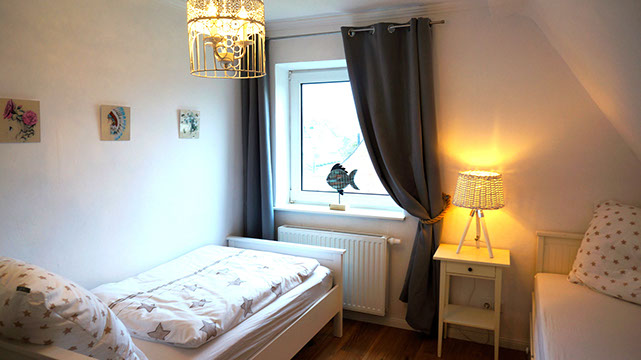 Im zweiten Schlafzimmer finden Sie zwei Einzelbetten, wobei sich eines der beiden in ein Doppelbett (1,60 x 2,0 m) verwandeln lässt. Dieses Zimmer haben wir ebenfalls mit einem Plissee im Fenster, sowie mit Vorhängen, die den Raum abdunkeln ausgestattet. Die Betten werden für Sie entsprechend der Gästeanzahl natürlich frisch bezogen.